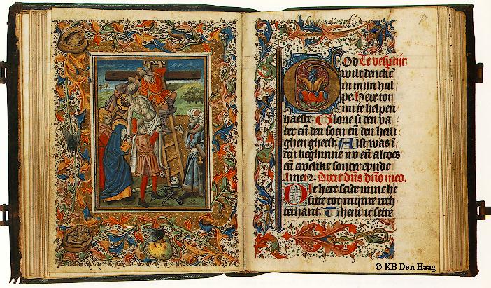 The miniatures illustrating the story of the Passion of Christ are especially remarkable because of their monumental, linear character. To achieve this the painter used the compositions of a series of prints by the Master E.S., an engraver working in the Rhineland between 1450 and 1467. Such copying from woodcuts and engravings was common practice among Northern Netherlandish illuminators in the second half of the 15th century.