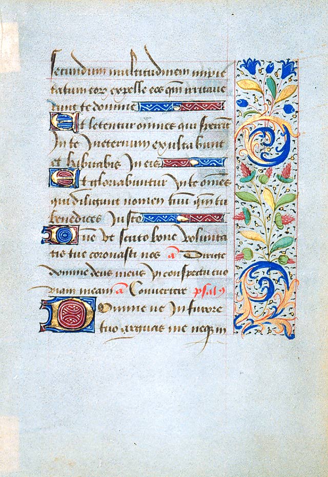 This beautiful manuscript leaf was written and illuminated about the year 1535. At this late date Books of Hours were also being printed in great numbers by such famous French printers as Vostre, de Colines, and Tory. These were elaborately illustrated and frequently hand-colored.