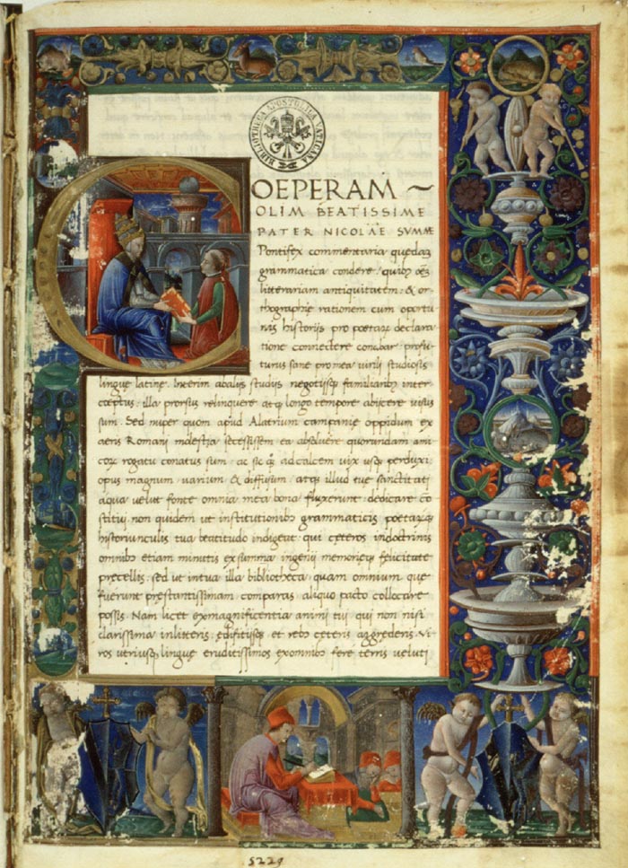 Pope Nicholas V, the real founder of the Vatican Library, also supported many scholarly enterprises. This fine presentation copy of Tortelli's critical Latin lexicon praises the pope lavishly, not only for his learning but also for his patronage of scholars, his support of translations from the Greek, and his project to create a great library, which Tortelli describes as "the most splendid that has ever existed."
